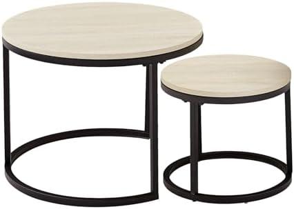TTATC Lot de 2 Tables Basses Rondes Gigognes avec Pieds en Métal, Plateau en MDF, Grande 60x60x45 cm et Petite 40x40x35 cm,Beige Blanc