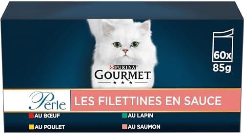 - 4 GOURMET PERLE | Adulte Chat | Les Filettines En Sauce | Bœuf, Poulet, Lapin, Saumon | 60 x 85 g | Sachet fraicheur