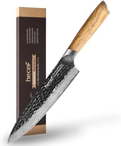 hecef Couteau de Chef Damas 20CM, Couteau Japonais Professionnelle en Acier Damas 67 Couches, Couteaux de Cuisine Forgé à la Main avec Manche en Bois d’olivier- Boite Cadeau