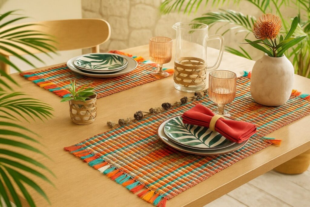 - Coloris : Rouge piment, bleu curaçao, blanc cassé – ambiance chaude et contrastée