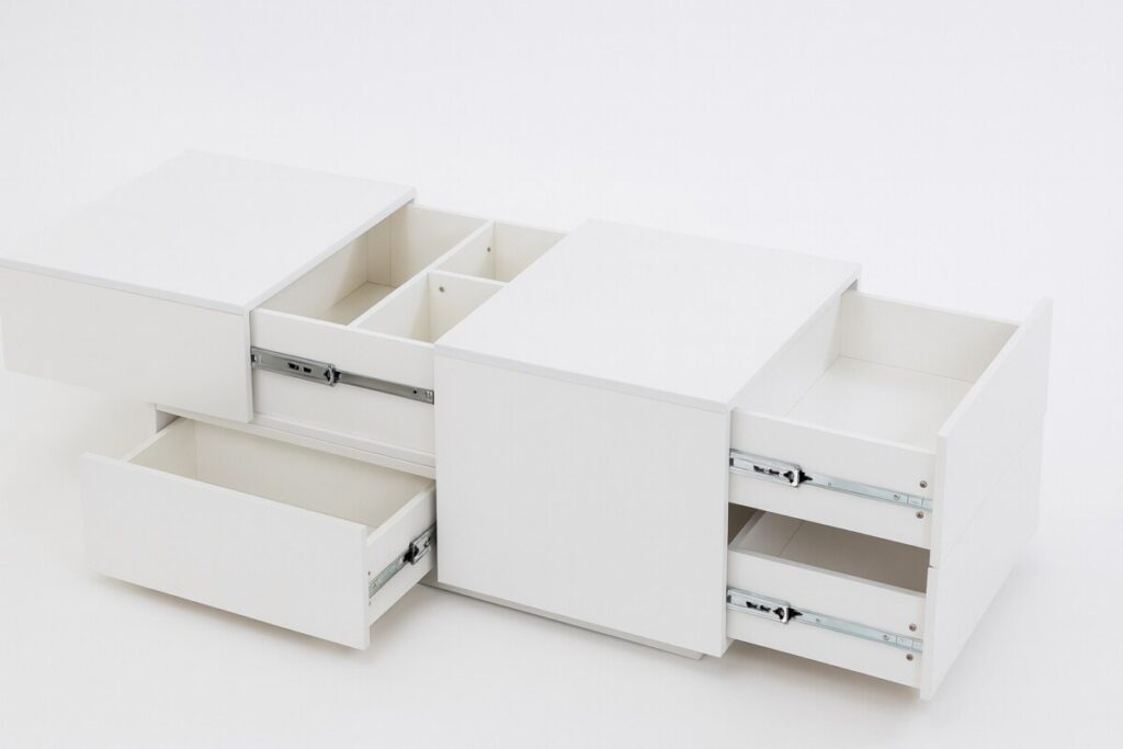 Ce n’est pas juste une table basse : c’est un meuble deux-en-un malin. Son plateau coulissant permet de la transformer selon les besoins : repas rapide devant une série, télétravail improvisé, ou simplement accès rapide à ce que vous cachez en dessous. Les 4 tiroirs sont parfaits pour désencombrer votre salon sans rien sacrifier à la déco.