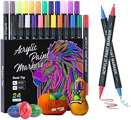 TrendGate 24 Couleurs Feutre Acrylique, Feutre Peinture Acrylique Double Pointe Fine et Pinceau, Marqueur Acrylique Pour Papier, Verre, Galet, Métal, Plastique, Bois, Oeuf, Céramique, Textile