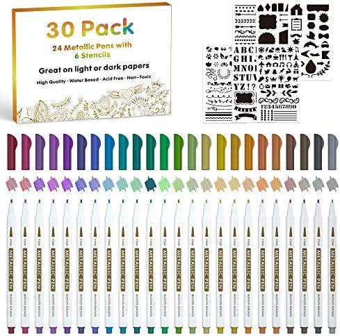 Paquet de 30 stylos marqueurs métalliques, Lineon 24 couleurs stylos à pointe fine avec 6 pochoirs pour bricolage album photo artisanat Rock Art peinture carte fabrication verre bois