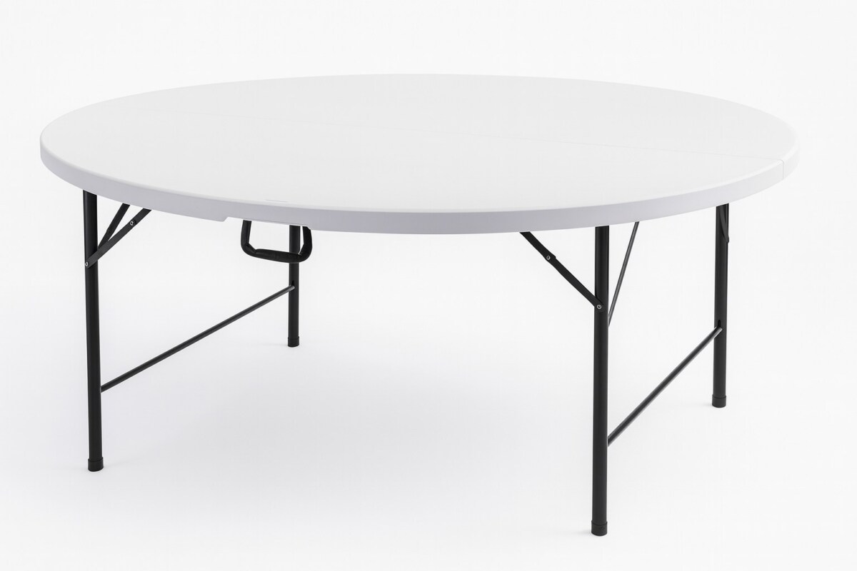 Cette table est le choix malin pour réunir jusqu’à 10 convives sans multiplier les tréteaux instables ni les nappes mal ajustées. Son plateau de 180 cm de diamètre offre une belle surface de réception, et ses pieds rabattables permettent de la plier en deux pour un rangement format valise avec poignée intégrée. Elle tient debout toute seule… mais se range à plat !