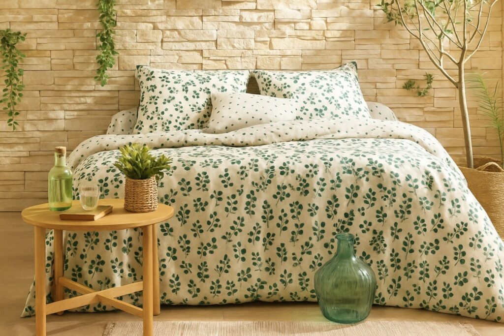 Avec ses motifs végétaux fins et discrets, dans une palette de verts tendres et de blancs lumineux, cette collection incarne le raffinement naturel. Confectionnée en pur coton, elle offre une qualité de sommeil optimale et une tenue impeccable lavage après lavage. Une parure idéale pour s’offrir un bol d’air pur… sans quitter son lit !
