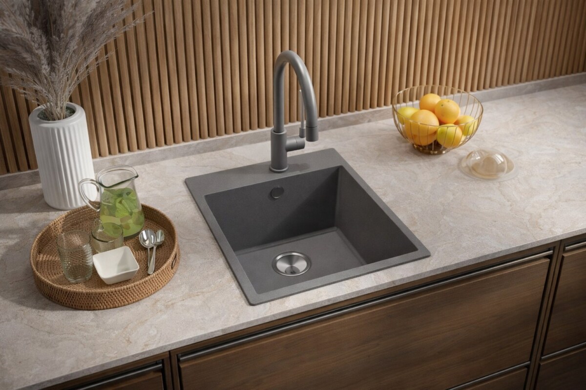 On ne le dira jamais assez : dans une petite cuisine, chaque centimètre compte. L’évier Riga 38×50 cm est taillé pour s’adapter aux meubles étroits (dès 40 cm), sans compromettre l’usage au quotidien. Fabriqué en granit composite, il résiste aux chocs, aux rayures, et à la chaleur. Et il ne se contente pas d’être costaud : son look gris sobre et moderne donne immédiatement du cachet au plan de travail.
