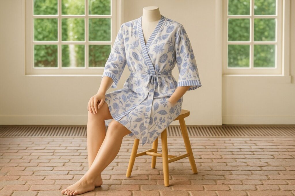 Le Kimono Nuit à Porto est l’allié idéal pour prolonger la douceur des vacances à la maison. Avec son imprimé floral raffiné et sa coupe fluide, il enveloppe votre silhouette dans un cocon de fraîcheur. À porter après un bain, en journée détente ou en guise de tenue d’intérieur chic, il offre un confort absolu avec une allure résolument féminine.