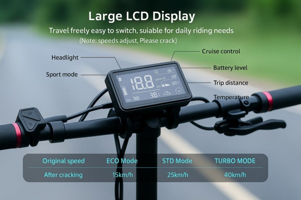 - Écran : LCD rétroéclairé (vitesse, batterie, mode)