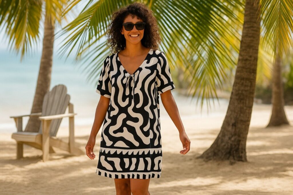 Cette robe coche toutes les cases d’un coup de cœur estival : coupe aérienne, matière fluide 100 % viscose, col V féminin, petits plis couchés pour le raffinement et motifs graphiques bicolores qui attirent tous les regards. Elle se porte avec des sandales plates, un chapeau de paille et un panier en osier pour un look vacances instantané, ou avec des accessoires plus sophistiqués pour sortir en ville.