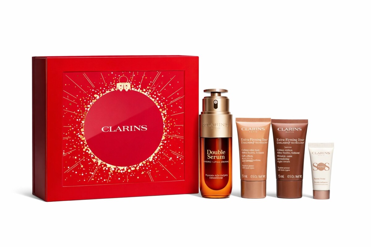 Clarins a réuni dans un même coffret ses soins iconiques pour un rituel anti-âge complet : le fameux Double Serum en format standard, les soins jour & nuit Extra-Firming, un primer illuminateur SOS, et une boîte cadeau élégante, recyclable et réutilisable. Une routine efficace, sensorielle et respectueuse de votre peau comme de l’environnement.