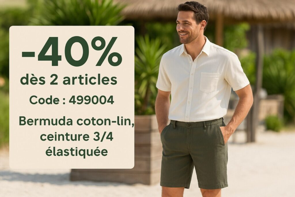 Léger, confortable, stylé… et ultra bien coupé : le bermuda 3/4 élastiqué coton-lin coloris bleu est une valeur sûre pour aborder les beaux jours avec aisance. En ce moment, il est proposé à partir de 29,99 €, et vous pouvez bénéficier d’une remise de -40 % dès 2 articles achetés avec le code promo 499004. Cliquez ici pour commander tant que toutes les tailles sont disponibles.