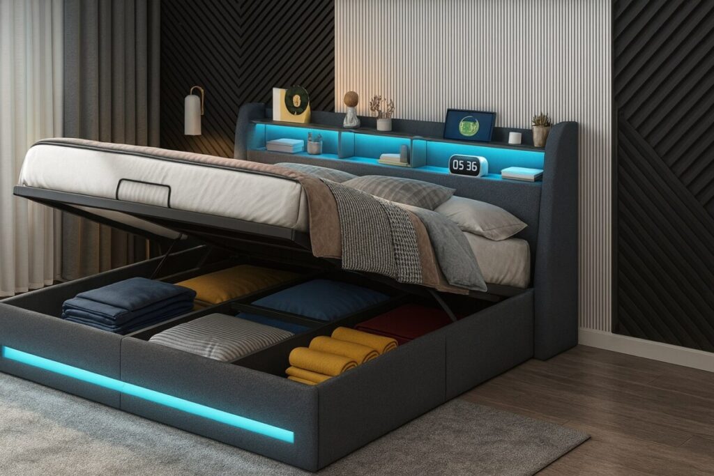 C’est exactement le genre d’offre qui disparaît en quelques jours, surtout avec ce type de produit qui combine design moderne, fonctionnalité intelligente et gains de place. Ce n’est pas seulement un lit, c’est un véritable hub de confort nocturne. Vous rechargez vos appareils pendant la nuit, créez une ambiance lumineuse relaxante, et cachez couettes, oreillers ou linge de lit dans le coffre intégré.