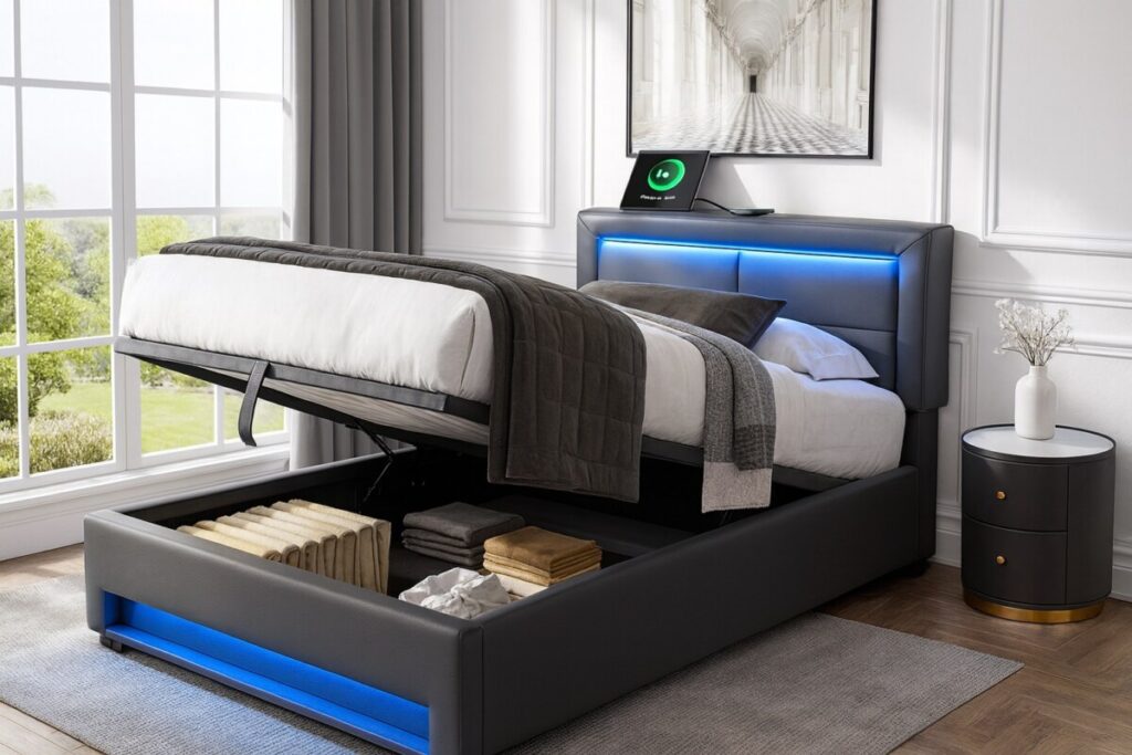 Un lit qui range vos affaires, recharge votre téléphone, illumine vos soirées et occupe un minimum d’espace ? Oui, ça existe. Et il est en promo sur Cdiscount à seulement 229,99 €. Le lit coffre 90×200 cm, avec port USB intégré (charge sans fil + filaire), éclairage LED, sommier relevable et design moderne est LE bon plan qui coche toutes les cases.