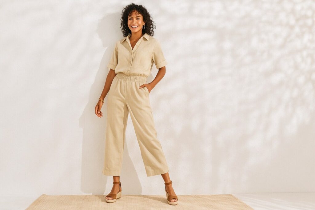Ce pantacourt coche toutes les cases du confort et de la tendance. Sa matière en coton (70 %) et lin (30 %) est parfaite pour l’été : respirante, légère, agréable à porter même par forte chaleur. Sa ceinture entièrement élastiquée avec lien à nouer assure un ajustement parfait et sans contrainte. Et avec sa coupe large, vous êtes libre de vos mouvements tout en conservant une allure structurée.