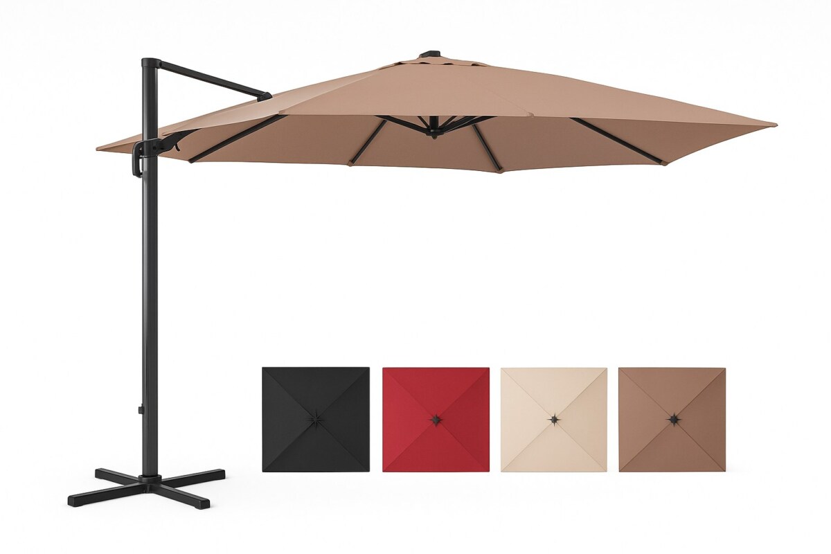 Ce modèle haut de gamme est doté d’un système rotatif à 360°, d’une toile polyester anti-UV, d’un mât robuste avec manivelle, et surtout d’une grande surface d’ombre de 9 m². Idéal pour terrasse, jardin, piscine ou même les cafés et restaurants.
