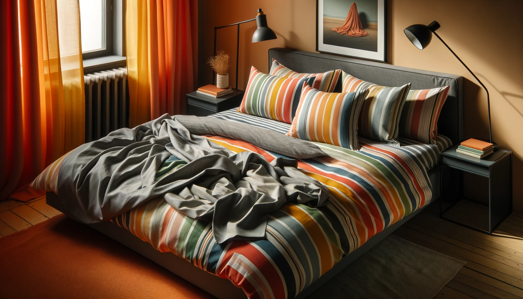 Fabriqué en satin 100 % coton, ce linge de lit offre une surface lisse et soyeuse, idéale pour un sommeil confortable. L’imprimé de rayures multicolores contre un fond uni gris apporte une touche de sophistication et de modernité à votre chambre.