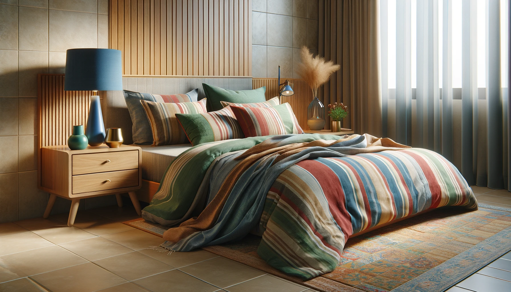 - Design Moderne : Les rayures multicolores et la finition passepoil gris irisé ajoutent une touche de modernité à votre chambre.