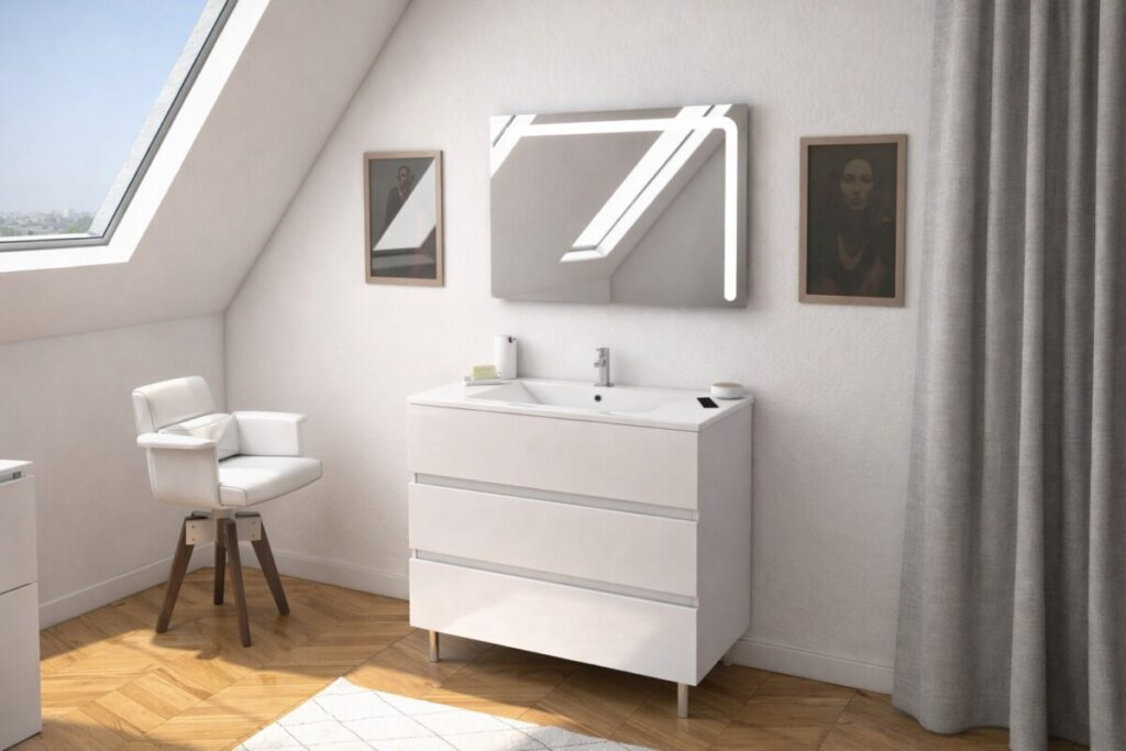 Le meuble sur pied est également un choix pratique pour ceux qui préfèrent éviter les fixations murales lourdes, ou veulent faciliter l’accès à la plomberie.