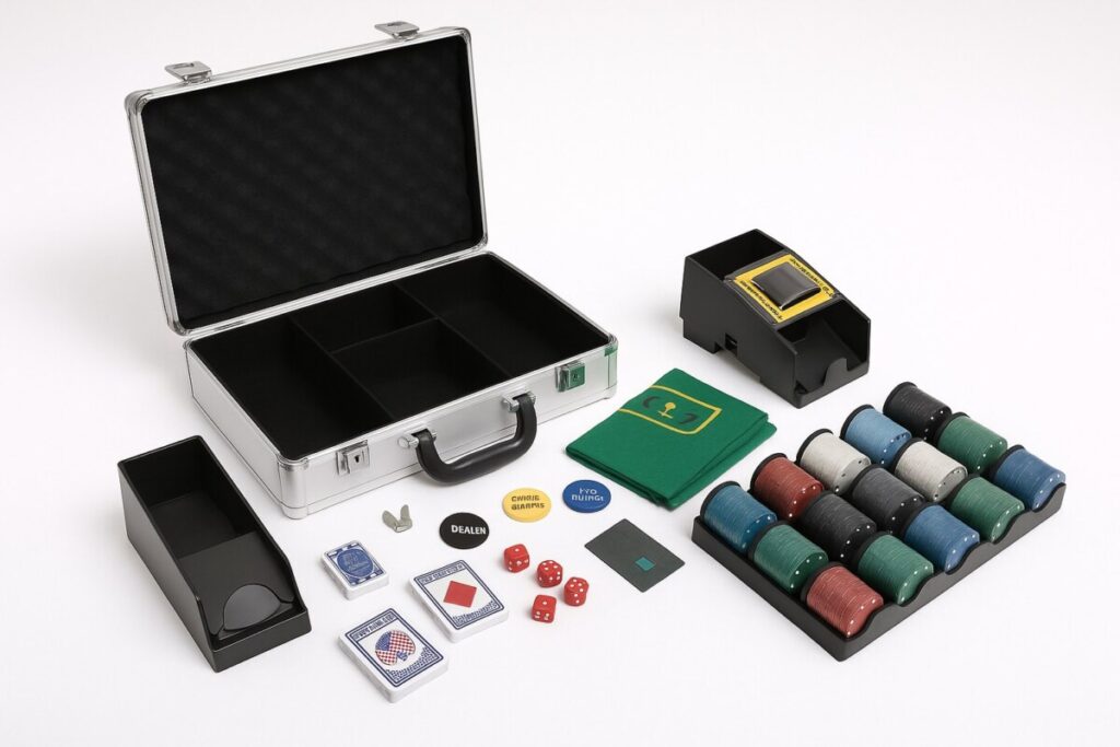 Jetons colorés, tapis de jeu, cartes, dés, mélangeur automatique, sabots et même les boutons du croupier et des blinds : tout y est. Il ne manque plus que vos amis et une playlist jazz en fond pour que la magie opère. Une chose est sûre : vous n’allez plus vouloir ranger cette mallette.