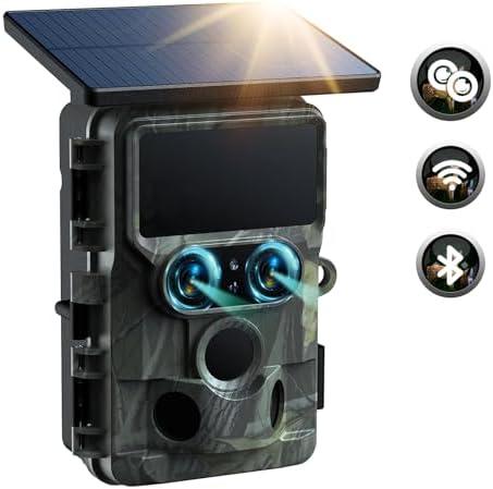 VOOPEAK Camera de Chasse Solaire Double Objectif, 4K 60MP Camera de Chasse WiFi Bluetooth, Caméra de Chasse Infrarouge Nocturne Activée par Mouvement IP66 Étanche pour Surveillance de la Faune