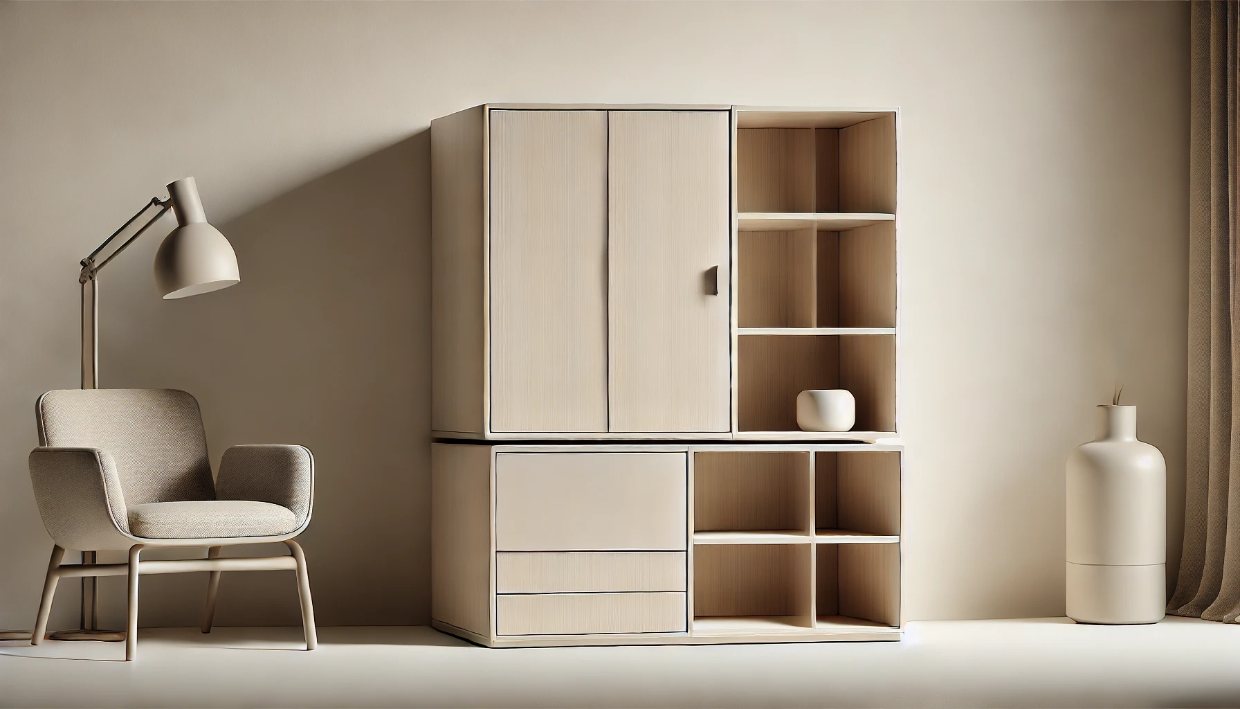 Avec ses deux cases ouvertes et sa porte dissimulant un espace de rangement supplémentaire, le meuble STAVRA est idéal pour organiser vos affaires personnelles, exposer vos livres ou mettre en valeur vos objets décoratifs. Son design épuré et sa finition en bois naturel apportent une touche chaleureuse à votre intérieur. Commandez-le ici.