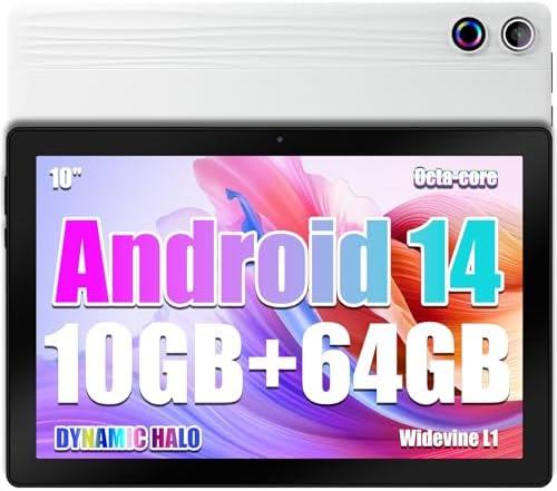 - 2 Tablette 10 pouces Android 14 Tablette Octa-Core Tablette, Widevine L1 10 Go + 64 Go + 1 To TF, WiFi 6 BT 5.3 Batterie 5000 mAh, Transmission OTG, Déverrouillage du visage, Prise casque Type C (Blanc)