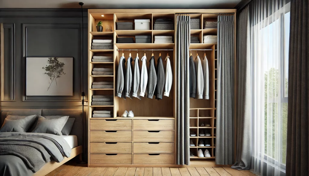 Ce dressing est conçu pour s’adapter à tous vos besoins de rangement. Son rideau pratique permet de dissimuler votre garde-robe en un clin d’œil, tout en apportant une note élégante à votre pièce. Profitez d’un rangement modulable, complet et stylé à un prix accessible !