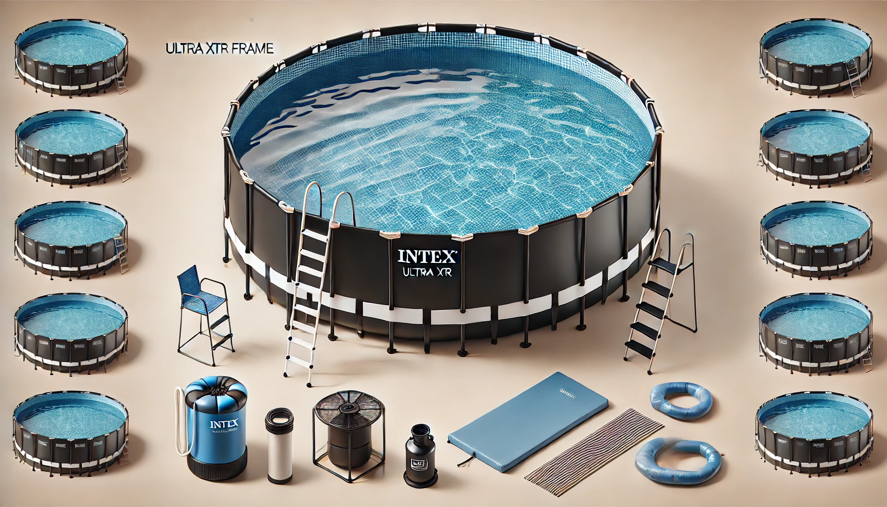 | Accessoires | Échelle, pompe de filtration, bâche, tapis de sol |