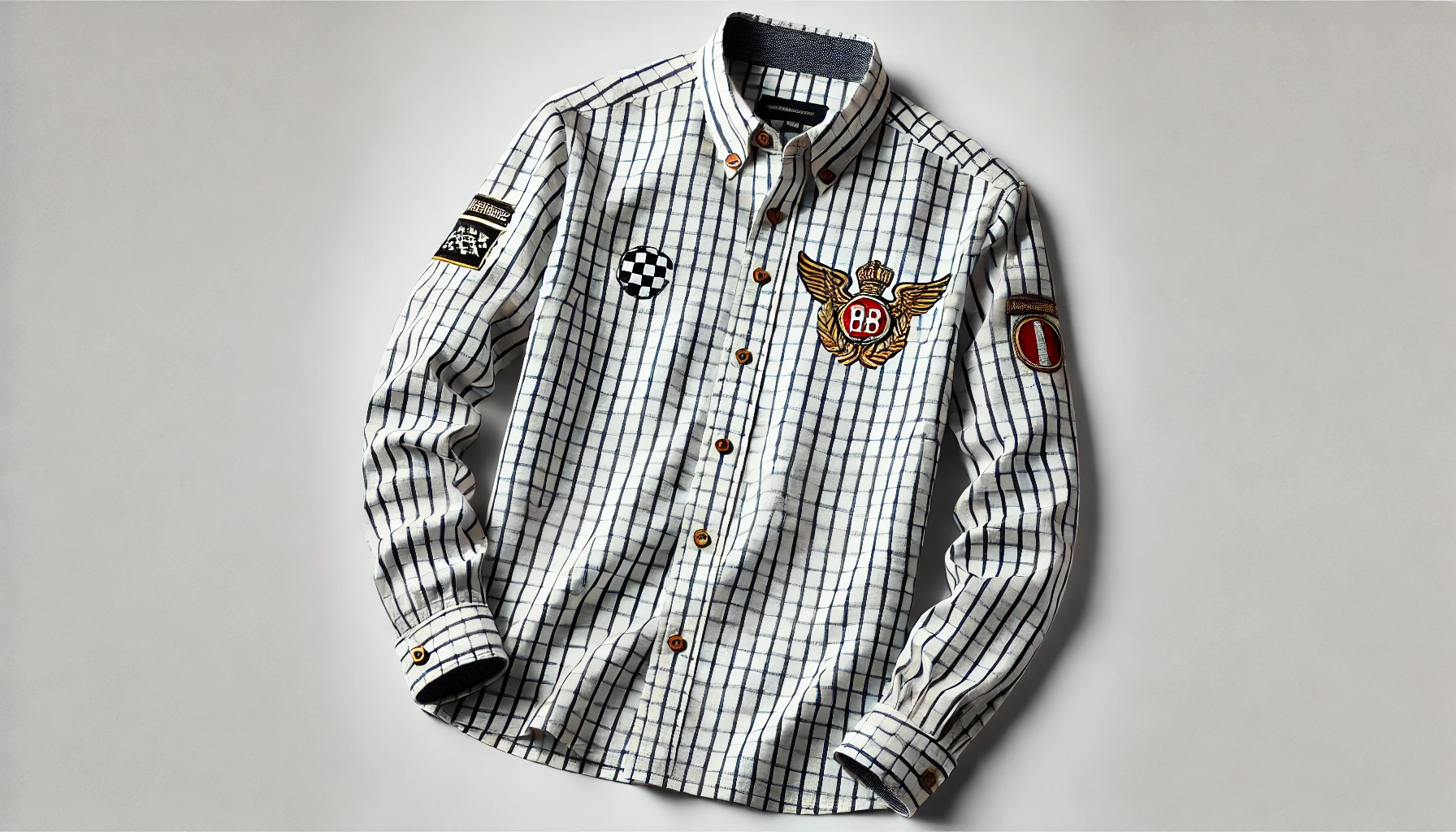 Fabriquée en popeline de coton émerisé de haute qualité (110 g/m²), cette chemise se distingue par son motif à petits carreaux gris et ses détails inspirés de l’univers de la course automobile. Les poignets à patte capucin doublés de chambray et les boutons gravés ajoutent une touche de sophistication.