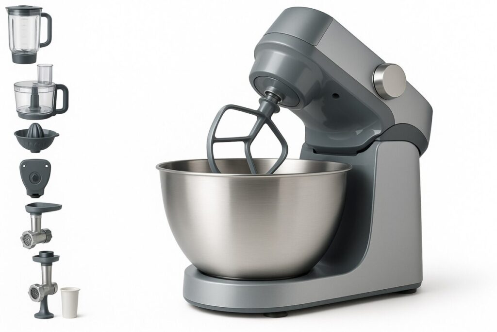 - Accessoires inclus : batteur, fouet à fils, crochet pétrisseur, blender en verre, disque éminceur, disque râpeur, presse-agrumes, couvercle anti-projections, balance électronique intégrée