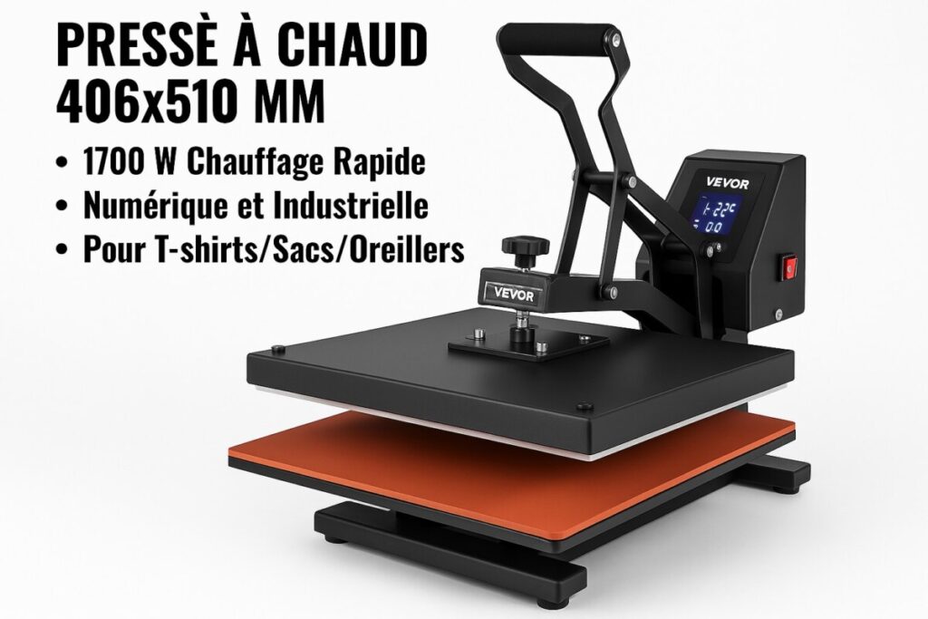Ne manquez pas cette opportunité unique d’acquérir la presse à chaud VEVOR 406×510 mm, une machine de sublimation textile de qualité industrielle, à un prix défiant toute concurrence ! Dotée d’une puissance de 1700 W et d’un chauffage rapide, cette presse est idéale pour transférer vos motifs sur des T-shirts, sacs, oreillers et bien plus encore. Mais attention, les stocks sont limités ! Cliquez ici pour profiter de cette offre avant qu’il ne soit trop tard !