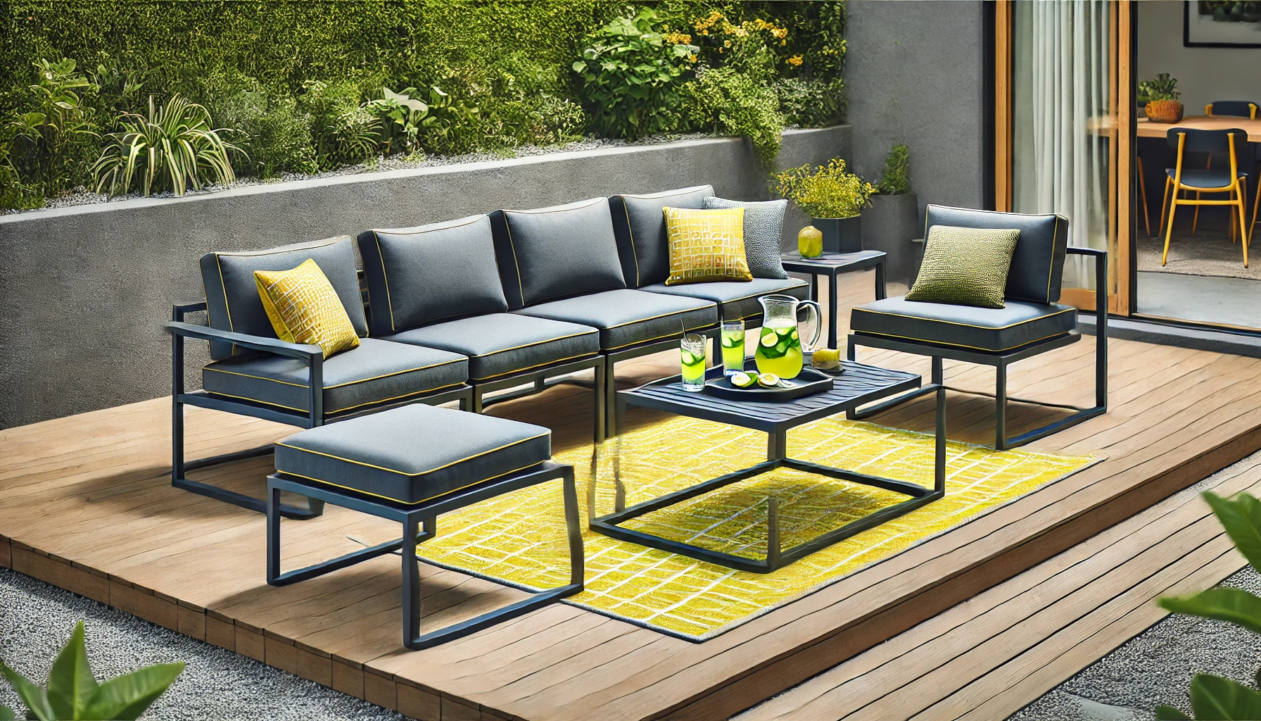 - Polyvalence : Système d’assise modulable permettant de transformer les bains de soleil en canapé.