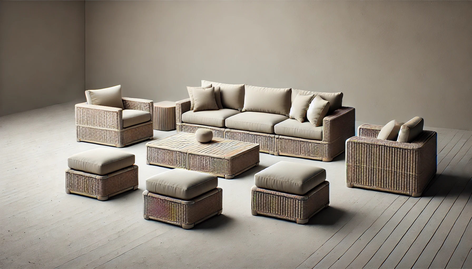 | Composition | 1 canapé 3 places, 2 fauteuils, 1 table basse, 2 poufs |