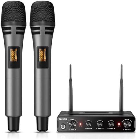 TONOR Micro Karaoke sans Fil, UHF Microphone Systèmes Dynamique Chant Portable à Main Double avec Récepteur pour Karaoké Fête Discours Mariage DJ Spectacles Église Conférences TW350 Gris