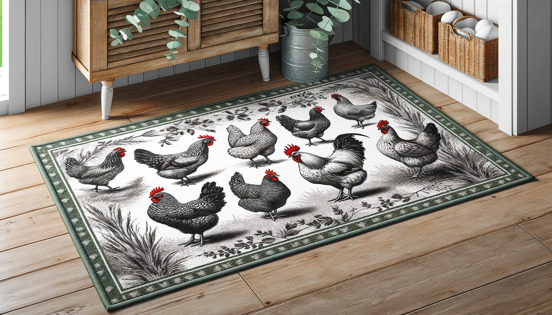 Ce tapis ne se contente pas d’être pratique ; il est une véritable œuvre d’art. Les motifs de petites poules évoquent la vie à la ferme, tandis que les détails fleuris ajoutent une touche de fraîcheur et de naturel. Le coloris vert dominant crée une atmosphère apaisante, idéale pour cuisiner dans les meilleures conditions.