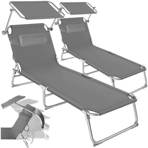 tectake® Set of 2 Folding Sun Lounger Outdoor Garden with Sun Visor & Headrest Reclining Beach Lounger Relax Garden Camping Outdoor Garden Lounge – Grey
