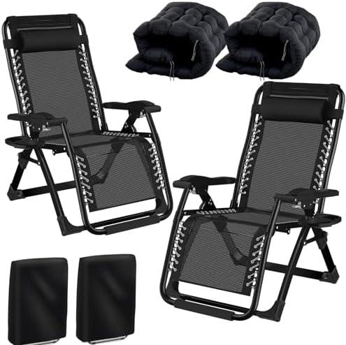 - 2 Fiutazge 2 x Outdoor Garden Sun Loungers, Garden Chair with Padded Cushion, Drink Holder, Headrest, Lounger Cover, Relax Lounge Chair for Patio, Beach, Swimming Pool, Black