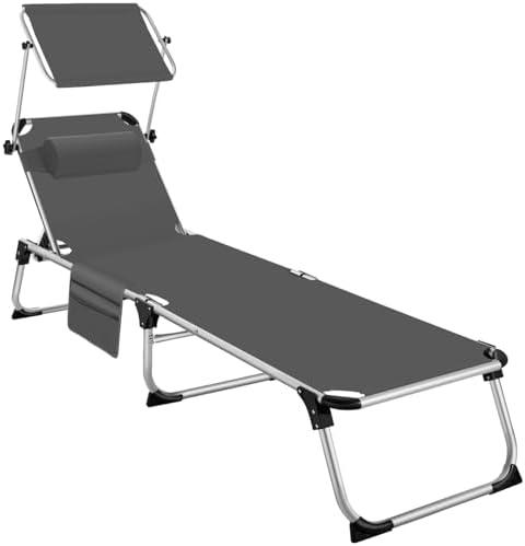 TecTake® Folding Sun Lounger Outdoor Garden with Sun Visor Reclining Beach Lounger Relax Garden Camping Outdoor Garden Lounge with Side Pocket