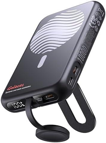 La banque d’alimentation magnétique sans fil Galeces 10000mAh est un chargeur induction portable 3-en-1 compatible avec les séries iPhone 16/15/14/13/12, l’iWatch et l’Airpods. Il est équipé d’une charge magnétique sans fil pour téléphone portable, d’une charge pour montre et d’une charge pour écouteurs, permettant de charger quatre appareils simultanément. Le port USB C permet également de charger les téléphones et tablettes Android Samsung. La batterie externe est dotée d’une capacité de 10000mAh, capable de charger un iPhone de la série 16/15/14/13/12 une fois, des Airpods de troisième génération environ 12 fois et une iWatch environ 12,5 fois. Un écran numérique LED permet de visualiser l’état de la puissance du chargeur, pour ne pas être pris au dépourvu.