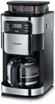 - 1 SEVERIN Cafetière avec broyeur intégré 1 000 W, Machine à café programmable avec minuteur, Cafetière filtre avec verseuse en verre d’une contenance de 10 tasses, Noir/Inox, KA 4810