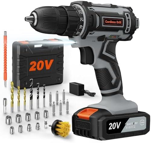 - 1 Perceuse Visseuse Devisseuse Sans Fil 20V, avec Batterie 2.0Ah, 42Nm, 25+1 Réglages de Couple, 2 Vitesse, Lumières LED, 25 Accessoires, Perceuse-Visseuse pour Bricolage à Domicile