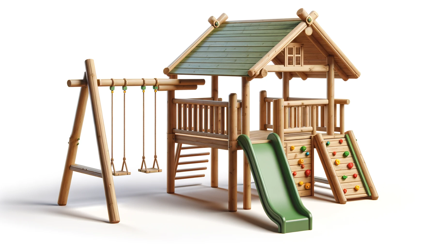La structure Woodi inclut tout ce dont les enfants rêvent : un toboggan ondulé vert avec raccord eau possible pour des glissades rafraîchissantes, deux balançoires haute qualité pour s’envoler vers de nouveaux horizons, un mur d’escalade équipé de pierres colorées pour grimper vers les sommets, une table de pique-nique pour des goûters mémorables, et même une cabane pour les explorateurs en quête d’aventures.