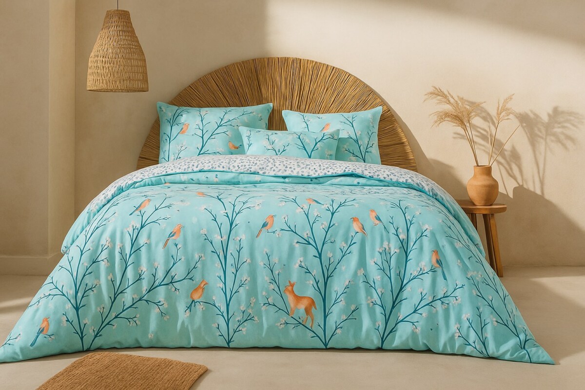 Parce qu’un bon sommeil commence dans un bel univers, la parure Juste avant l’Aurore a été pensée comme une invitation à la douceur. Ses motifs de feuillages stylisés, comme dessinés à l’encre, ses couleurs poudrées (gris perle, rose nude, écru) créent une atmosphère zen et lumineuse. Elle trouve sa place dans une chambre scandinave, bohème ou contemporaine.